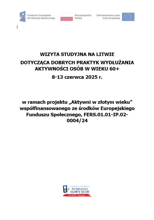 Zapraszamy do zapoznania się z Raportem pt. "WIZYTA STUDYJNA NA LITWIE DOTYCZĄCA DOBRYCH PRAKTYK WYDŁUŻANIA AKTYWNOŚCI OSÓB W WIEKU 60+".